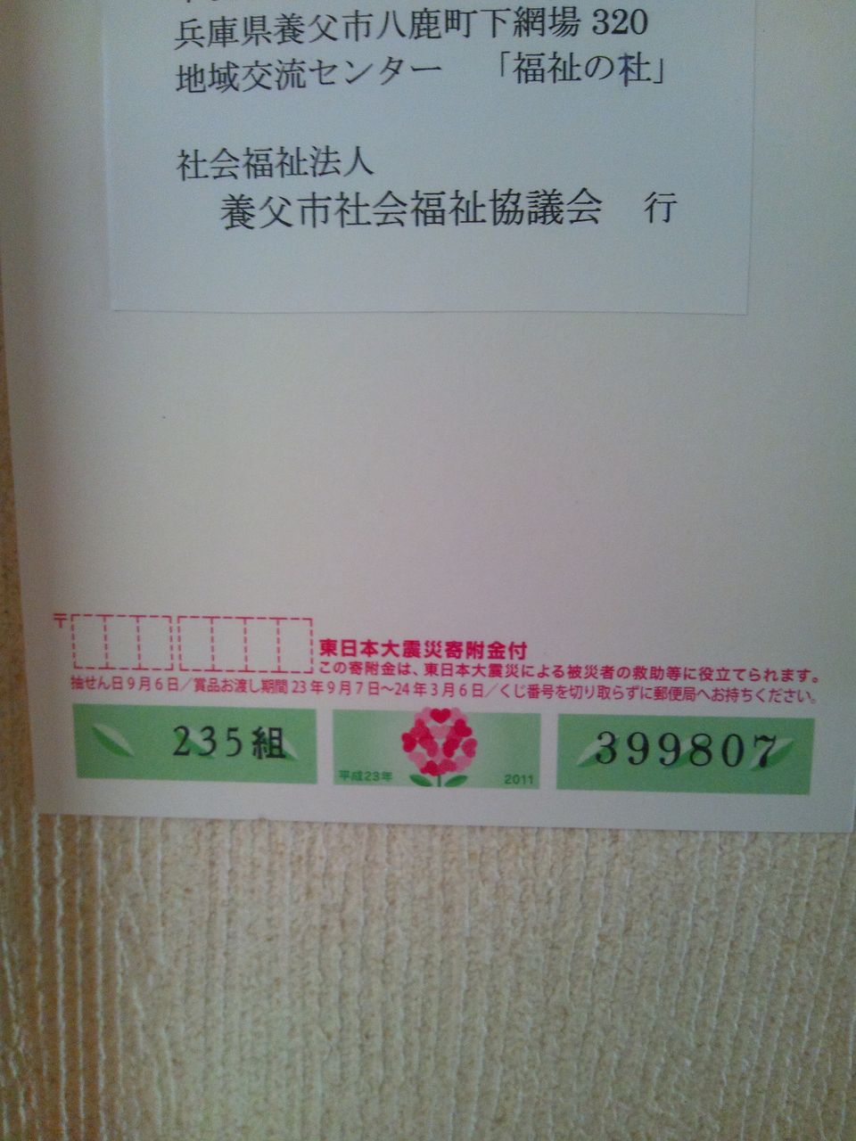 高柳郵便局の独自企画です。養父市社会福祉協議会にカモメール(義援金付き)でおくるとまとめて石巻市に送るそうです。皆さんどうぞ~ 葉書を買うときに義援金付き葉書にするために買うのもいいかも